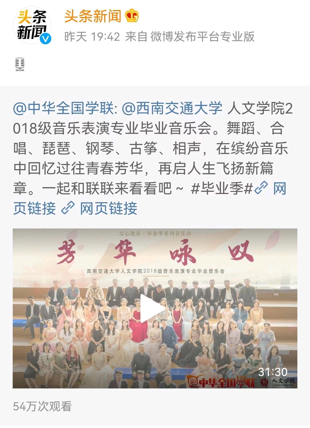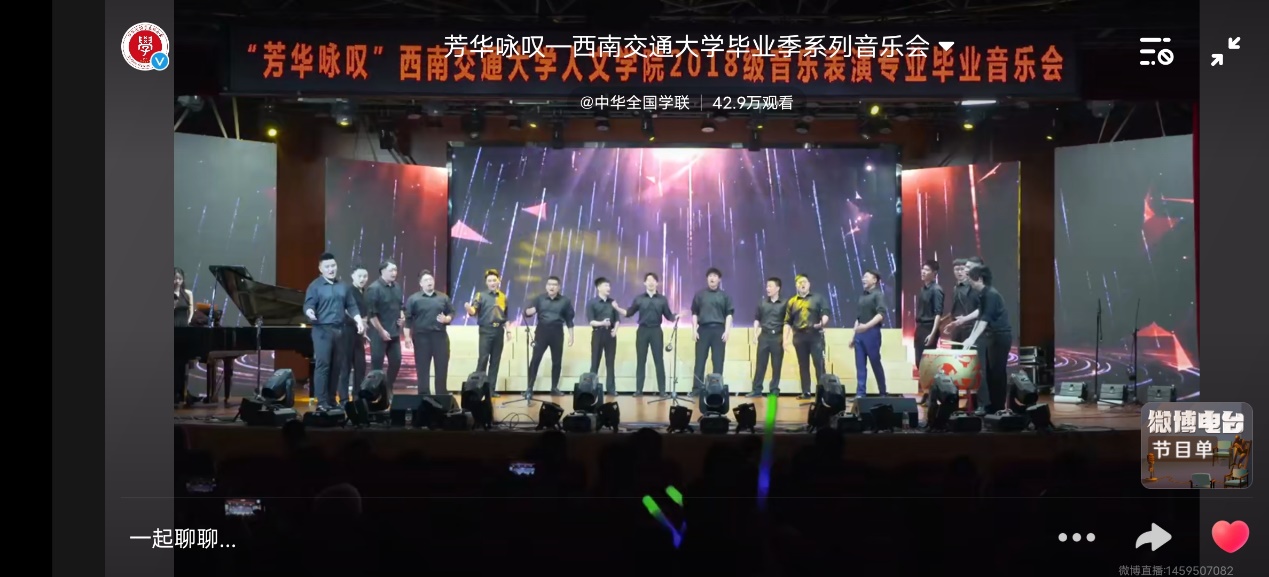 演出结束后,我们这里收到了刘飞云老师的一些话,刘老师说很对不起2018级音乐表演专业的毕业生,因为考虑到晚会的整体效果,很多同学没有能够展示自己的主专业,没有把自己最擅长的东西带给观众,这也许就是交大的特色一专多能。刘老师表示这场演出很成功,热烈的掌声、站着看完整场晚会的观众以及场外53万在线观看的观众就是送给毕业生最好的礼物。希望同学们初心永驻!不负韶华!不负时代!