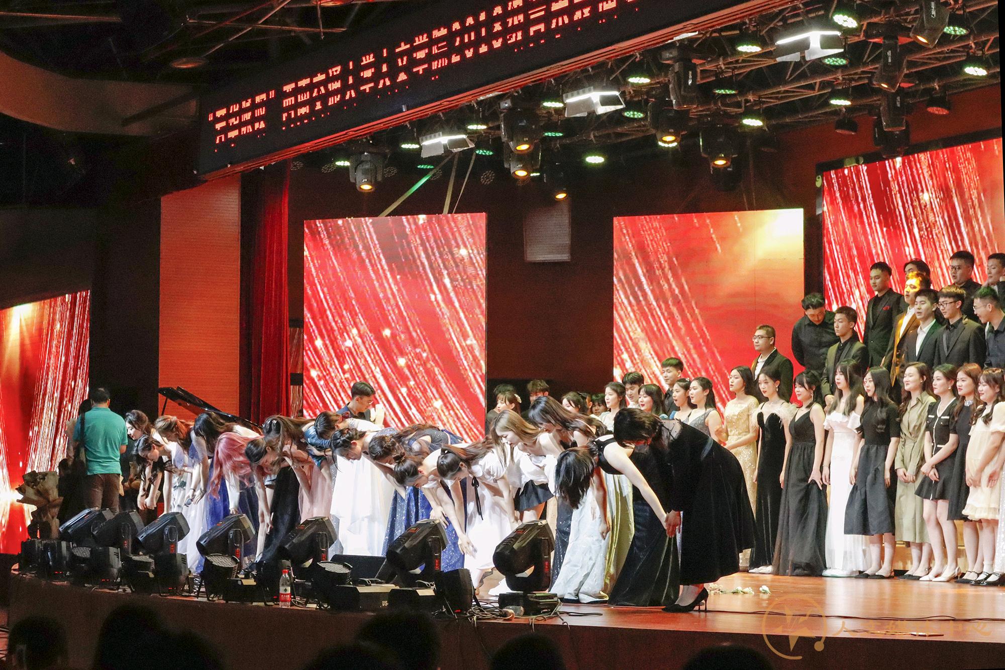 晚上10点,主持人邀请在场的领导嘉宾和音乐系老师上台合影,音乐系学子为老师们献上鲜花,表达敬意与感恩。毕业生们拥抱着恩师、拥抱着同学,拥抱着属于他们的青春和舞台。