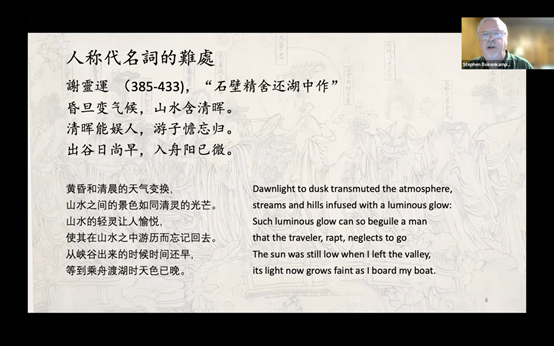 其次,柏夷教授讨论了英文翻译中人称代词的问题。在讲座举办前,吕鹏志教授与弟子廖文丽同学合作对组诗进行了白话翻译,并发送给柏夷教授以供参考。这些白话翻译让柏夷教授发现了他此前英译中存在的问题。他解释道,英文诗歌中,人称代词频繁出现。而中国古代的诗歌中却很少出现人称代词,仅在帝王和神仙身上偶尔会发生。随后,柏夷教授以宇文所安(Stephen Owen)教授所译谢灵运《石壁精舍还湖中作》为例,解释了英译中文古诗时不得不补入人称代词的困境。