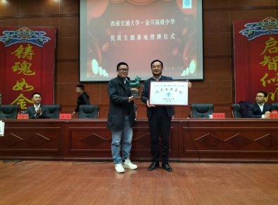 一行的到来表示热烈欢迎和衷心感谢。他首先介绍了学校的基本情况、发展历程、办学特色,尤其重点介绍了近年来学校在高考中取得的优异成绩和学生的升学情况。他表示,金川高级中学始终秉持深耕教学,潜心育人的教育理念,而能够成为西南交通大学的优质生源基地,既是对学校近年来在拔尖创新人才培养、高质量生源输送所取得成绩的肯定,同时也是对学校今后育人工作的鞭策。“学校将以此为契机,进一步探索优质生源培养新途径,深化与高校的交流合作,着力提升办学实力,为西南交通大学输送更多品学兼优的高素质创新人才,实现中学教育与大学教育的良性互动。”孙亘堂讲道。