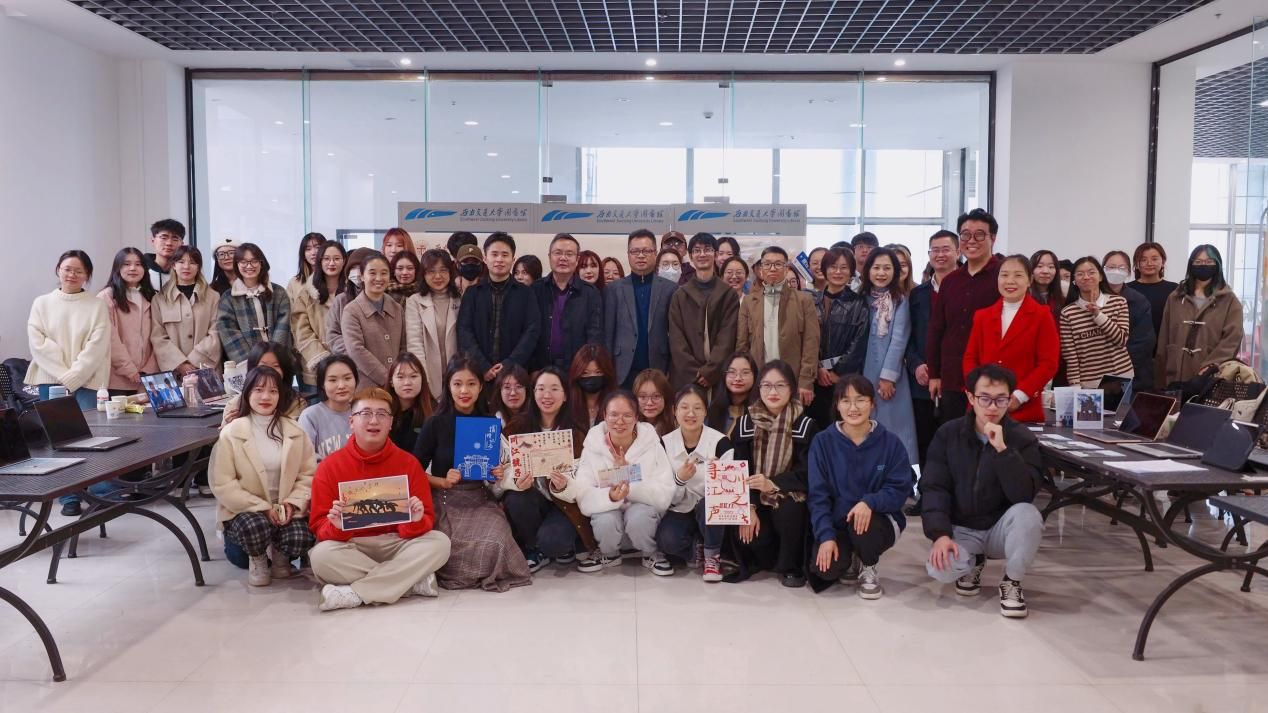在活动开展中,审核老师们首先参观了各组同学们的作品,领导们亲切询问同学的创作情况,以互动的方式与小组进行交流问答。同学们展示出自己小组的策划书、视频作业、新闻评论文稿资料、特色文创作品等等,老师也在观阅的同时不断对制作过程、结构、思路、意义等方面提出问题,并提出宝贵的改进意见,也给予了高度的肯定与赞扬。在场小组围绕“交通+传统文化”的主题,交出了高水平的答卷,如“寻川江之声——号子传承还需在群众中‘活’起来”,“茶马精神:千年积淀的文化瑰宝”等,都生动展现了交大青年对讲好交通故事、助力传统文化传承与传播的热忱之心。
