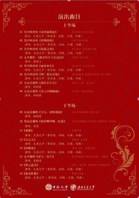 音乐系杨树莉教授和九里之声四重唱组合:郭清波、孙轶、王强、马健老师为中南大学的师生们带来了《我住长江头》、《主人,请听我说》、《桑塔露琪亚》、《海港之夜》、《森林水车》、《成都》、《回娘家》、《游击队歌》等中外经典曲目。演出受到了中南大学师生热烈欢迎,现场掌声如潮,气氛热烈,观众打着拍子为老师们的演唱鼓掌喝彩。本次演出促进青年学子的音乐审美能力和艺术素养,也是西南交大澳门赌场老虎机