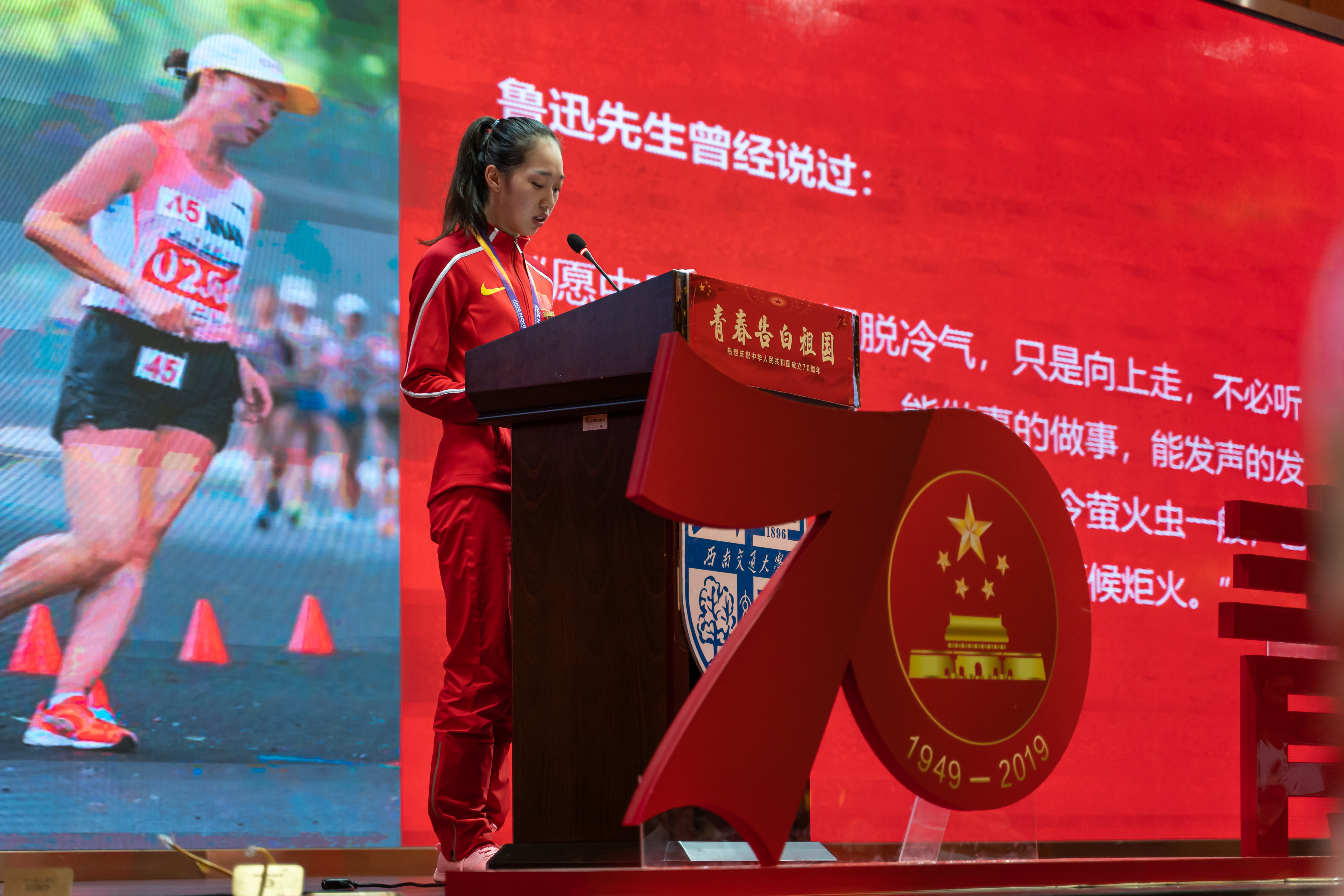 2019级新闻传播专业新生,她曾在2017年世锦赛赛场上勇夺竞走季军。身披国旗为国争光的背后,是枯燥乏味、漫长艰辛的训练。晕倒、拉伤、贫血都没有打败杨树青,她克服了思乡之苦和追求体育梦路上的种种嘲讽与质疑,怀着一颗为国征战、回报祖国的赤子之心坚持“走”了下去。五星红旗让她有机会站上世锦赛的赛道,更赋予了她拼命向前、势不可挡的意志。她高呼“中国体育有我,有千千万万体育人”时眼含泪花,饱含对在背后培养、支持她的祖国的无尽感激。现场掌声雷动,现场师生都被这份热忱深深打动。