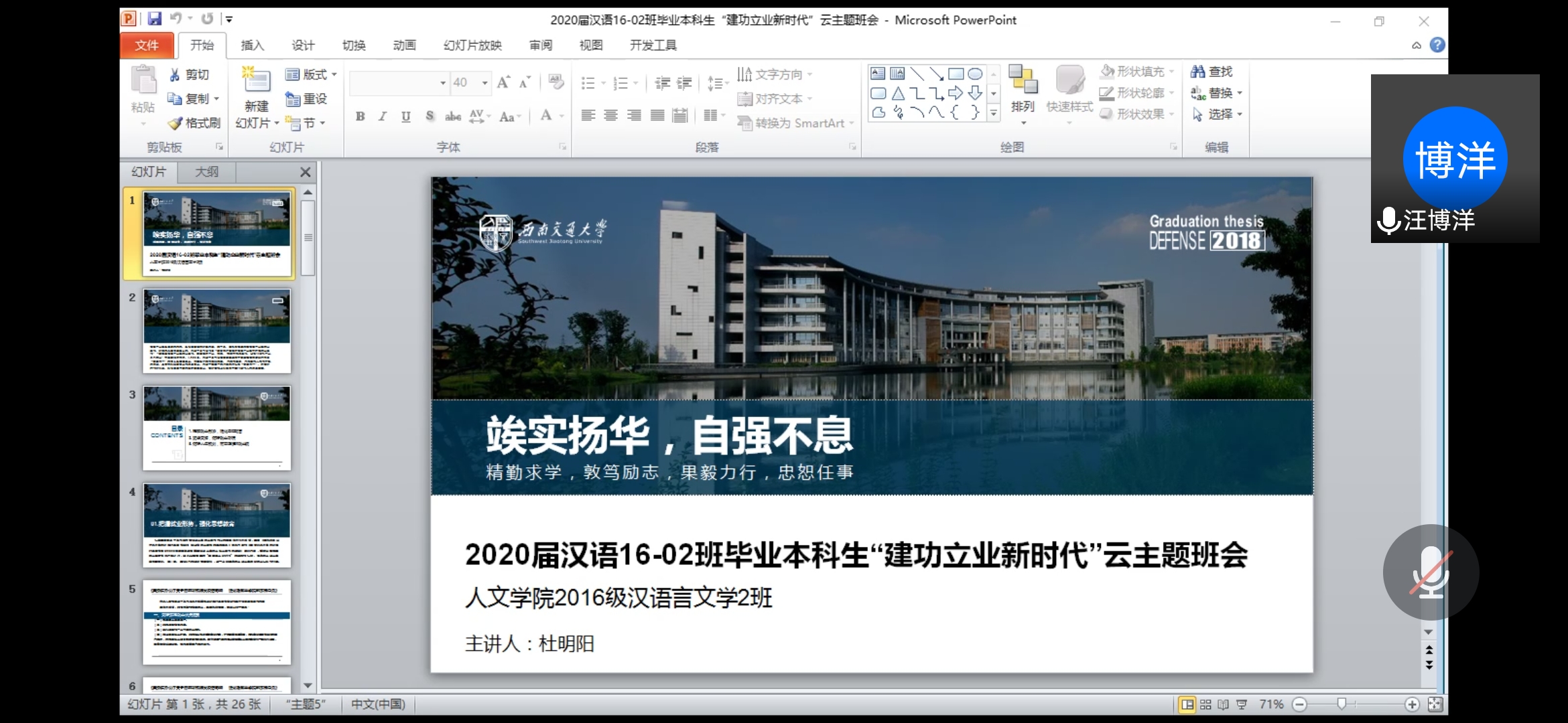 2020届本科毕业生辅导员刘爽老师组织各班级分别召开了“建功立业新时代”主题班会。班会旨在帮助毕业班学生把握就业形势、了解就业政策,鼓励毕业班学生抓住新时代的新机遇,积极担当,积极作为,为国家发展贡献力量。