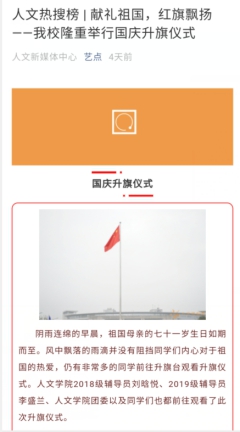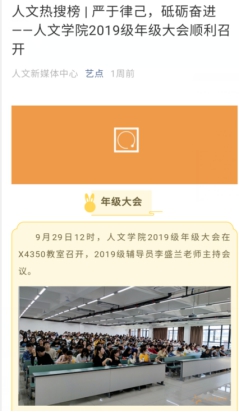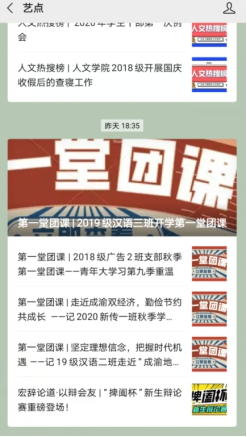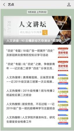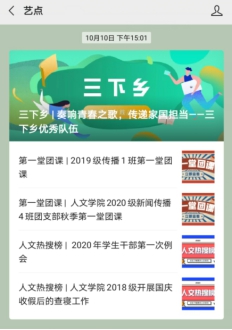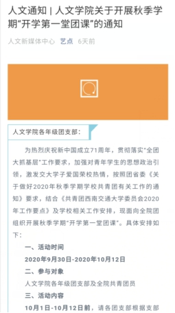 官方微信公众号“艺点”发布开展秋季学期“开学第一趟团课”通知,指导全院学生结合爱国主义教育主题和优秀传统文化教育主题开展第一堂团课。