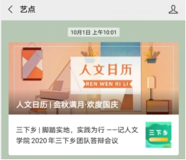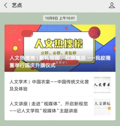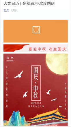 在官方微信公众号“艺点”上推送“喜迎中秋 欢度国庆”专题人文日历,丰富爱国主义教育与中华优秀传统文化教育活动形式。