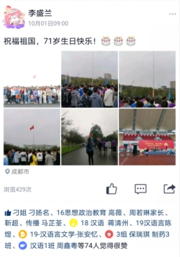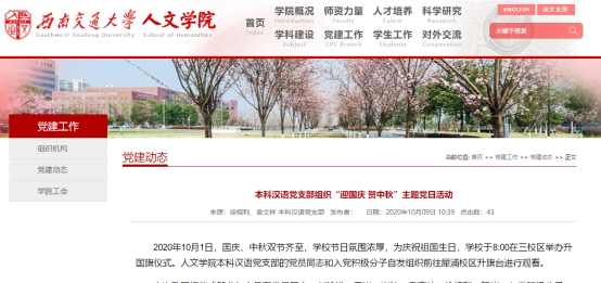 组织团委学生干部和各年级学生参加犀浦校区国旗台举行的升旗仪式和在体育场开展的双节嘉年华活动,全院学生踊跃参与,形成了浓厚的爱国主义教育和优秀传统文化教育学习氛围。
