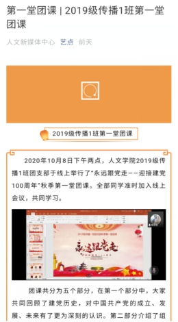 2019级传播一班团支部在线上举行“永远跟党走——迎接建党100周年”秋期第一堂团课,集中学习建党历史,激发爱党爱国真挚情感。