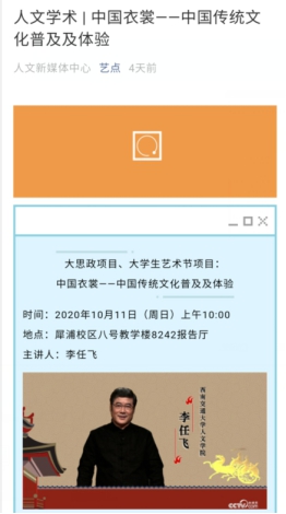 官方微信公众号“艺点”发布《中国衣裳——中国传统文化普及体验活动》通知,并开始积极筹备人文特色品牌活动传统文化体验周,将优秀传统文化教育与澳门老虎机