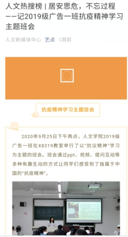 2019级广告一班在X8319教室开展“抗疫精神”主题学习班委,通过观看PPT、视频、提问互动等方式让同学们感受到了独属于中国的“抗疫精神”,进一步增强了全班的爱国主义情怀。