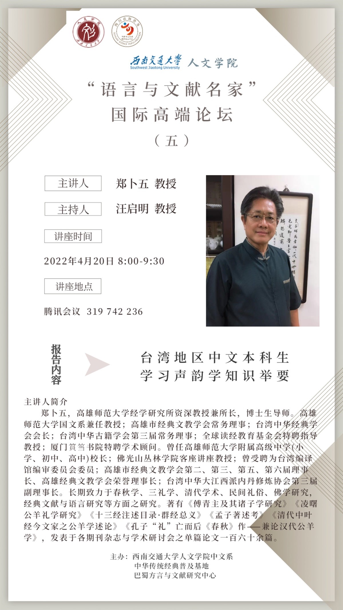 郑卜五,高雄师范大学经学研究所资深教授兼所长,博士生导师。高雄师范大学国文系兼任教授;高雄市经典文教学会常务理事;台湾中华经典学会会长;台湾中华古籍学会第三届常务理事;全球读经教育基金会特聘指导教授;厦门篔筜书院特聘学术顾问。曾任高雄师范大学附属高级中学(小学、初中、高中)校长;佛光山丛林澳门老虎机