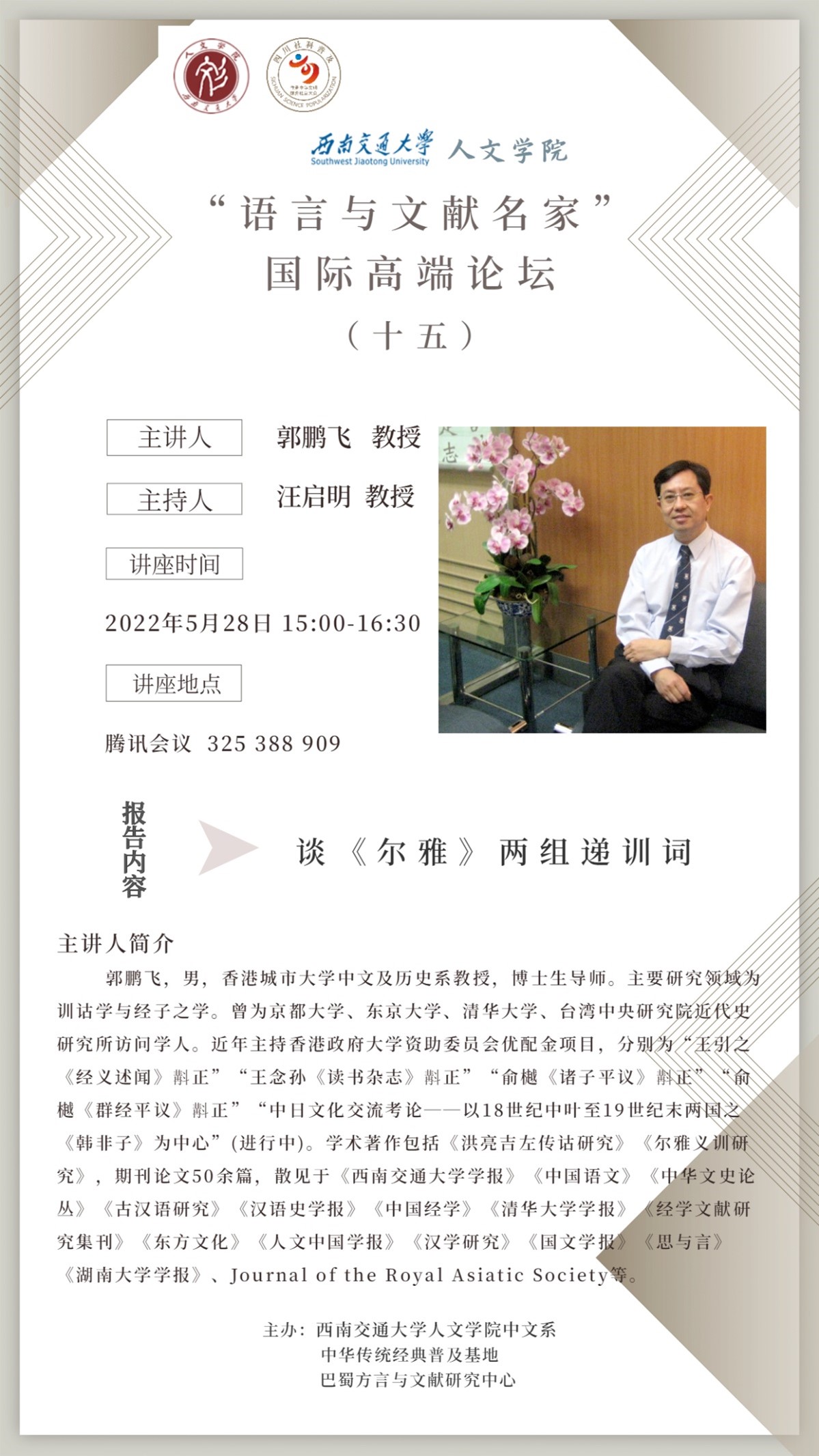 郭鹏飞,男,香港城市大学中文及历史系教授,博士生导师。主要研究领域为训诂学与经子之学。曾为京都大学、东京大学、清华大学、台湾中央研究院近代史研究所访问学人。近年主持香港特区政府大学资助委员会优配金项目,分别为“王引之《经义述闻》斠正”“王念孙《读书杂志》斠正”“俞樾《诸子平议》斠正”“俞樾《群经平议》斠正”“中日文化交流考论──以18世纪中叶至19世纪末两国之《韩非子》为中心”(进行中)。学术著作包括《洪亮吉左传诂研究》《尔雅义训研究》,期刊论文50余篇,散见于《西南交通大学学报》《中国语文》《中华文史论丛》《古汉语研究》《汉语史学报》《中国经学》《清华大学学报》《经学文献研究集刊》《东方文化》《人文中国学报》《汉学研究》《国文学报》《思与言》《湖南大学学报》、Journal of the Royal Asiatic Society等。