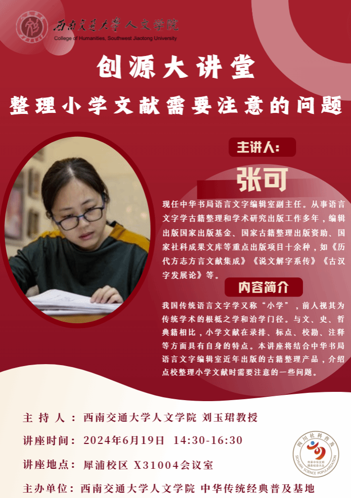 主讲人介绍:张可,现任中华书局语言文字编辑室副主任。从事语言文字学古籍整理和学术研究出版工作多年,编辑出版国家出版基金、国家古籍整理出版资助、国家社科成果文库等重点出版项目十余种,如《历代方志方言文献集成》《说文解字系传》《古汉字发展论》等。