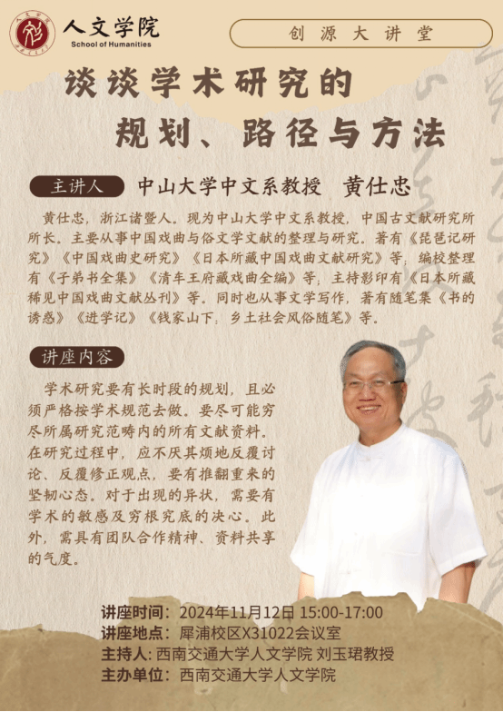主讲人介绍:黄仕忠,浙江诸暨人。现为中山大学中文系教授,中国古文献研究所所长。主要从事中国戏曲与俗文学文献的整理与研究。著有《琵琶记研究》《中国戏曲史研究》《日本所藏中国戏曲文献研究》等;编校整理有《子弟书全集》《清车王府藏戏曲全编》等;主持影印有《日本所藏稀见中国戏曲文献丛刊》等。同时也从事文学写作,著有随笔集《书的诱惑》《进学记》《钱家山下:乡土社会风俗随笔》等。