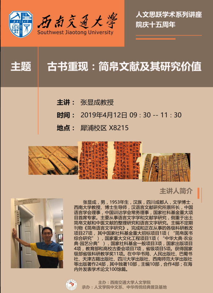 张显成,男,1953年生,汉族,四川成都人,文学博士,西南大学教授、博士生导师,汉语言文献研究所原所长,中国语言学会理事,中国训诂学会常务理事,国家社科基金重大项目首席专家。主要从事语言文字学和文献学研究,侧重于出土简帛文献和中医文献的整理研究和语言文字研究。主编不定期刊物《简帛语言文字研究》。完成和正在从事的各级科研教改项目27项,其中国家社科基金重大招标项目1项(“简帛医书综合研究”),国家重大文化工程项目1项(“中华大典·农业典·园艺分典”),国家社科基金一般项目3项,国家出版项目4项,教育部和高校古委会项目7项,省级项目5项。获得国家级部省级科研教学奖11项。在中华书局、人民出版社、巴蜀书社、天津古籍出版社、四川大学出版社、西南师范大学出版社等出版著作24部,其中独著10部,主编10部,合作4部;在海内外发表学术论文100馀篇。