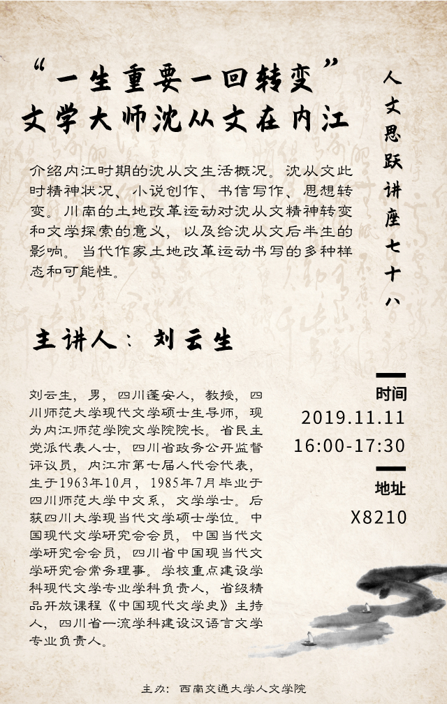 【讲座题目】“一生重要一回转变”:文学大师沈从文在内江