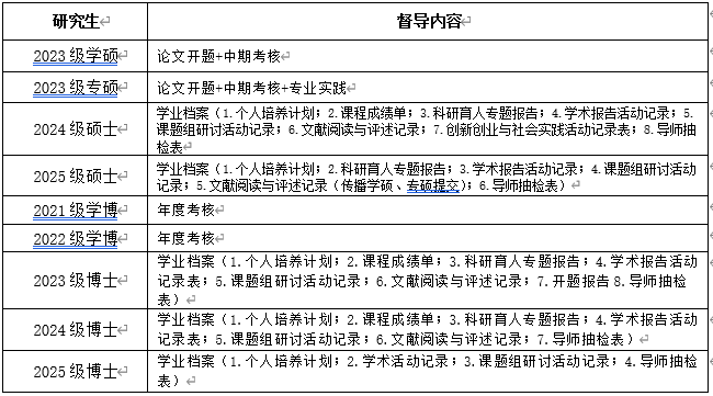 根据学校《关于开展2025年度研究生培养过程质量督导工作的通知》要求,将在院校两级开展研究生(含留学生)培养过程管理质量的督导与检查工作,具体工作安排如下: