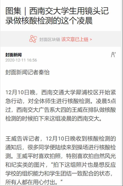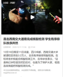Just this morning when the nucleic acid test was completed, the "Cover News" app, the top ten most influential mainstream media in China, sent two video news in succession: "after the nucleic acid test was finished overnight, Southwest Jiaotong University students recorded videos to cheer for Chengdu" and "Southwest Jiaotong University finished the nucleic acid test overnight, and the students lined up in order." In the official microblog push of "Cover News", the number of the first video reading continued to rise, breaking through 1.4 million in less than three hours.
