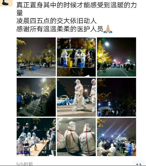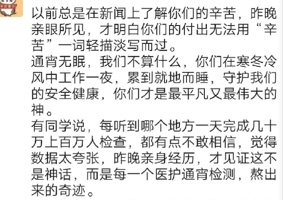 The College of Humanities has a warm heart. We should pay tribute to the medical staff in white, to the teachers and students who did nucleic acid testing in a serious and orderly way that night.